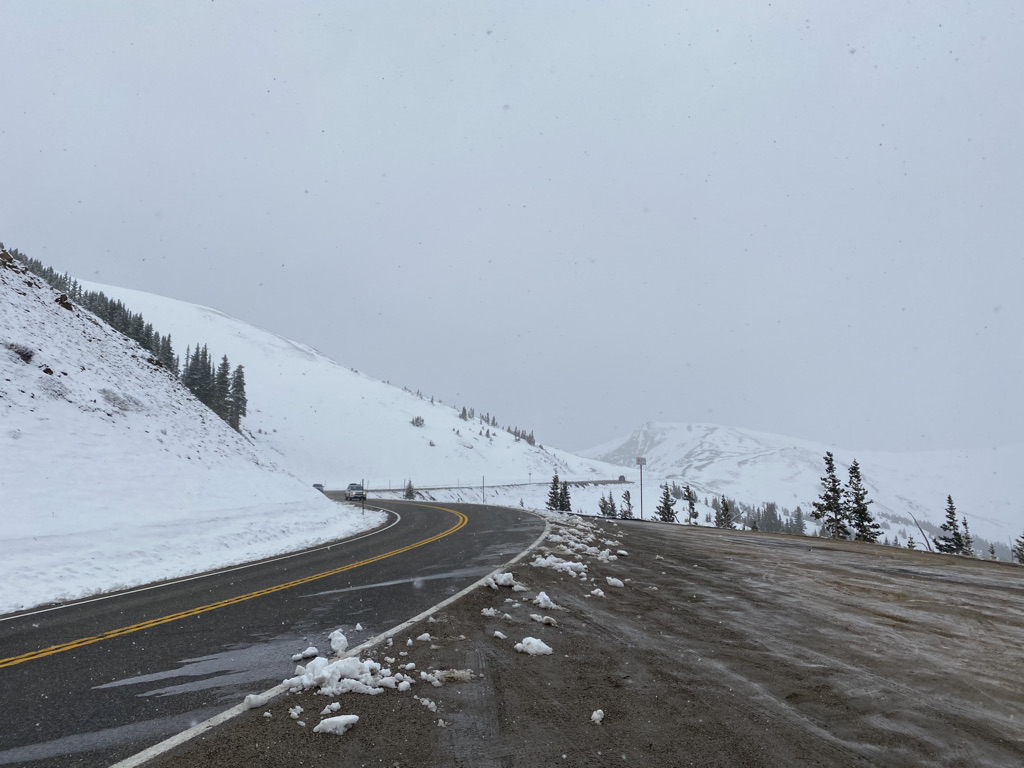 Much of the ground was still covered with snow. Unlike on Lookout Mountain, I was the only one on a bicycle on the road up to Loveland Pass that day. The only other people I encountered were backcountry skiing. One joking asked me for a ride to the top of the pass on my handlebars.